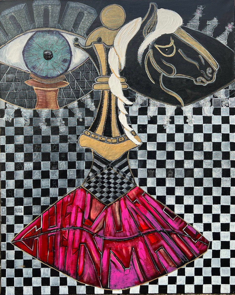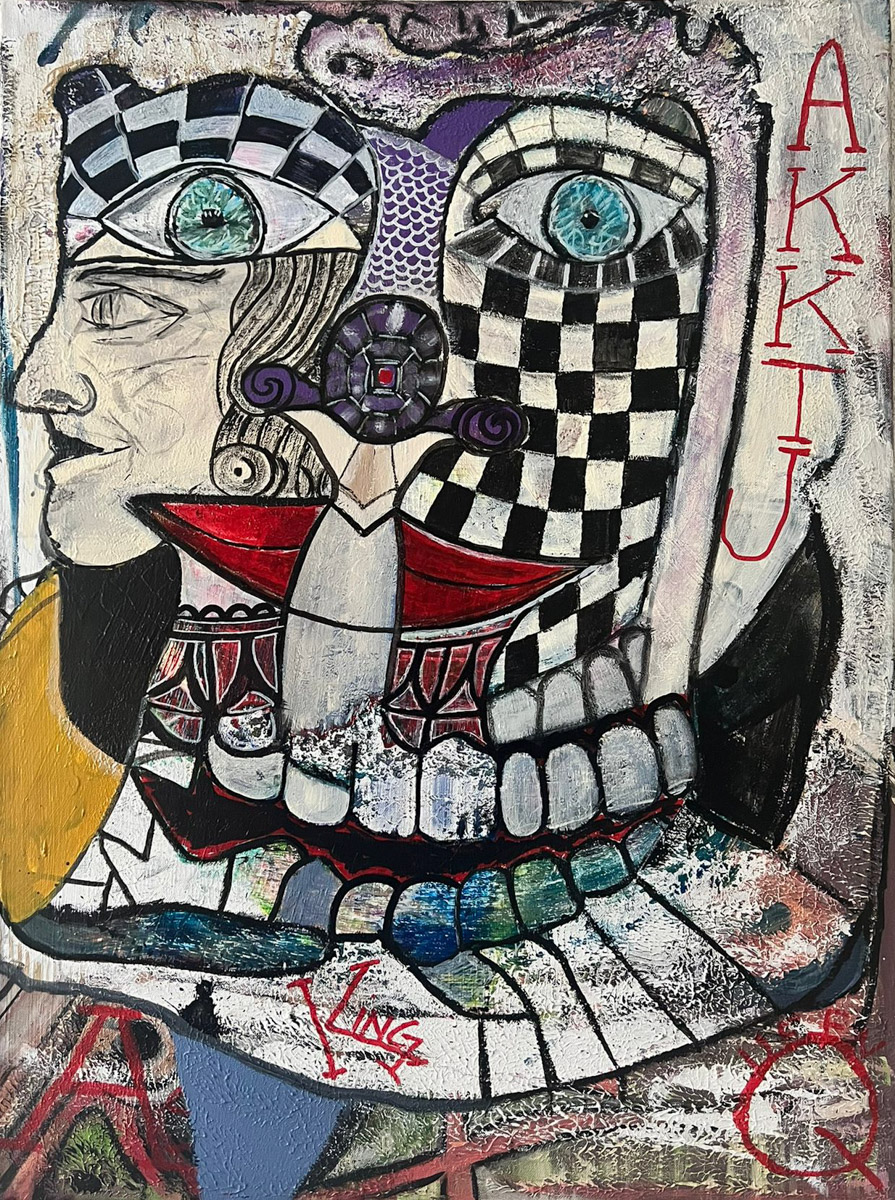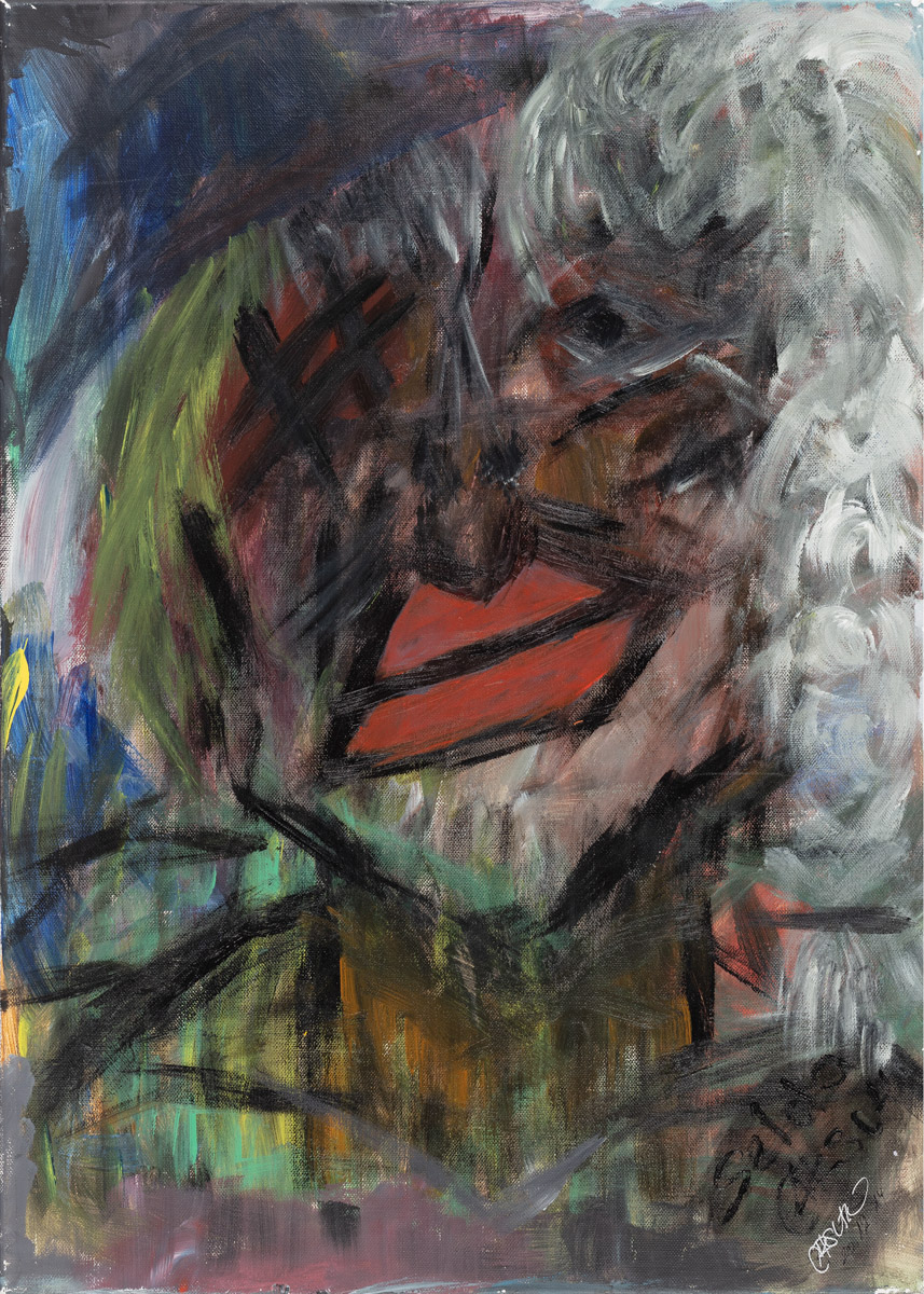Her visual language is multifaceted and emotionally charged: dark, sometimes bizarre figures coexist with colorful, expressive abstract forms. Each artwork functions as a narrative space, carrying its own story and inner logic.